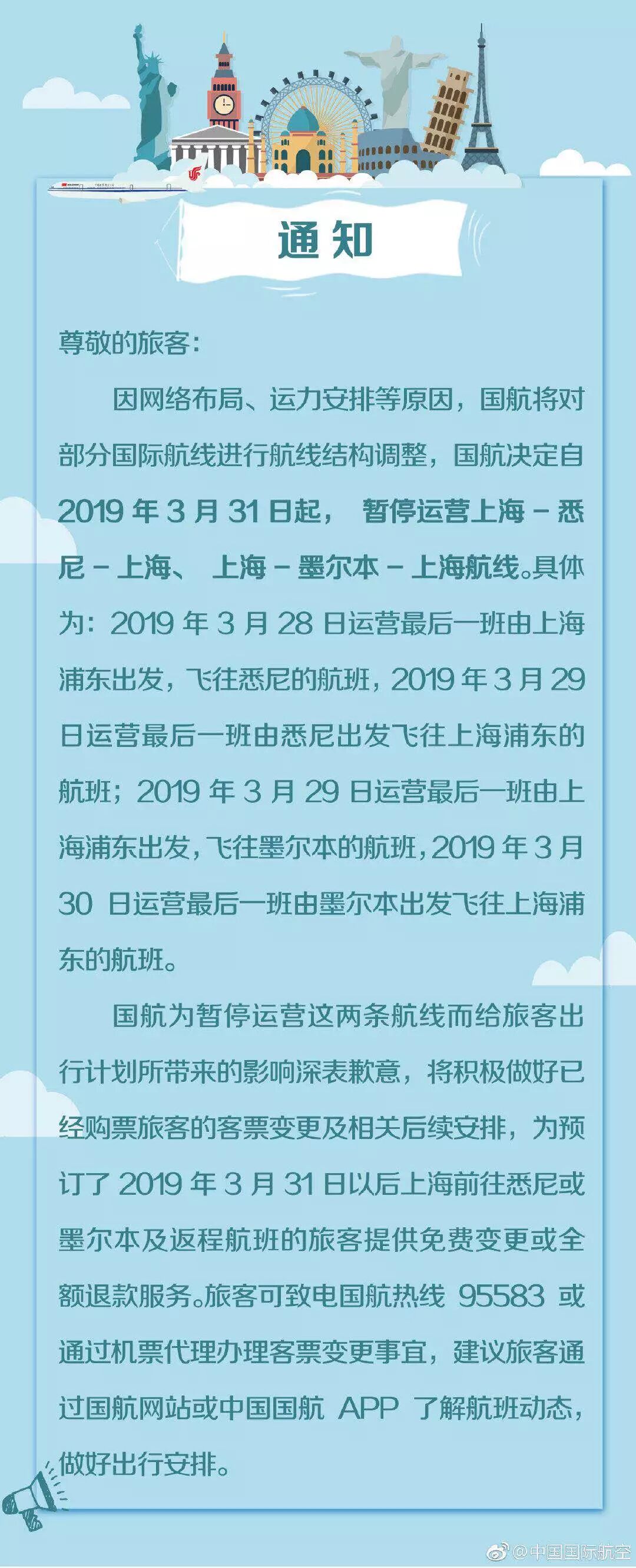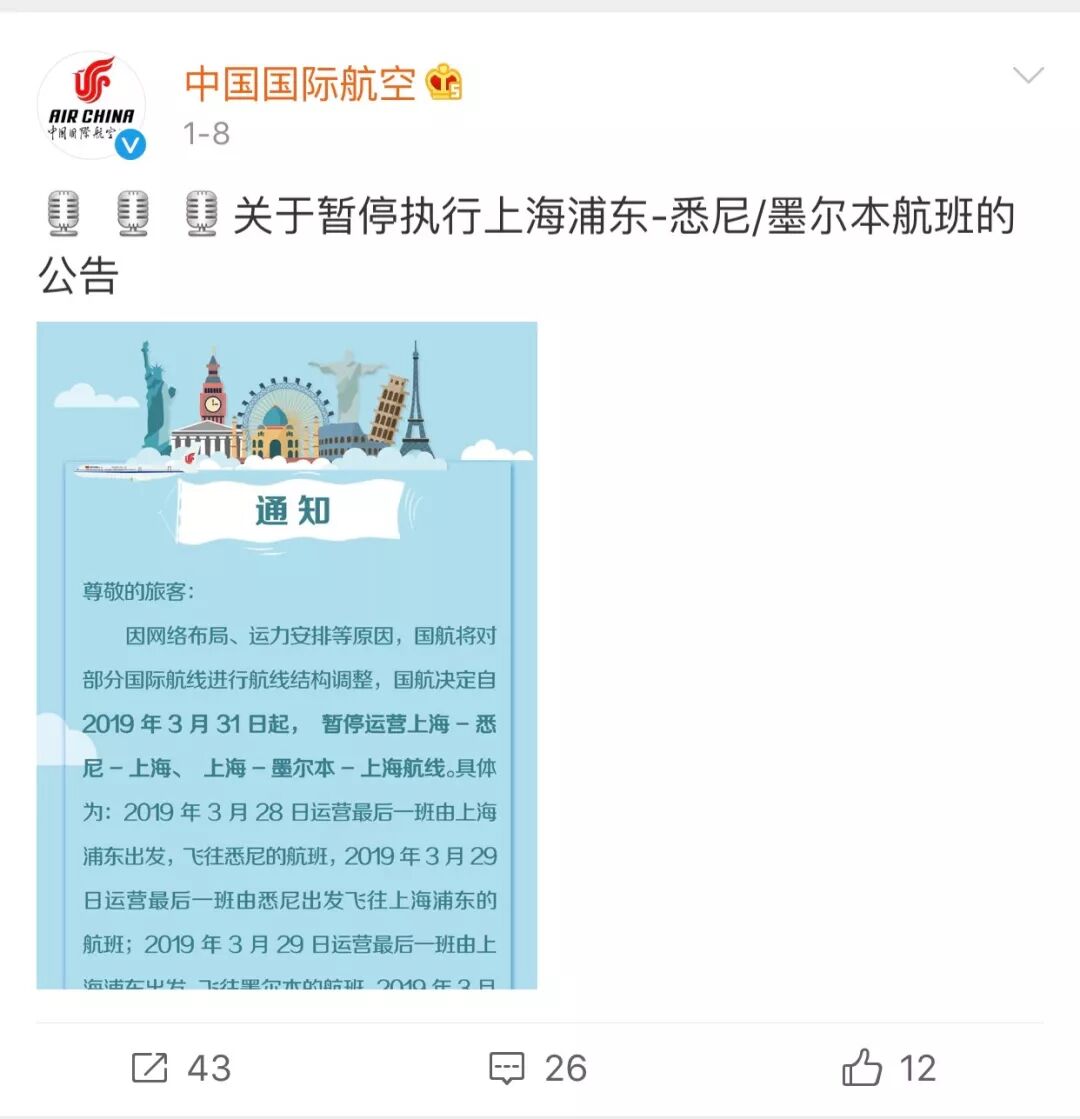 决定从2019年3月31日起,暂停其的以下两条到达澳洲的航线: