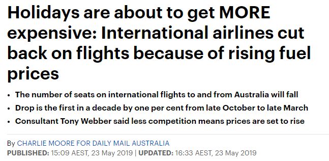 这就是澳洲航空面临的困境,国际航班因为燃油价格的上涨,被迫取消航班班次,国内航空公司同样受燃油价格上涨,外加公司垄断的影响,价格飙升将是最大可能的结果。