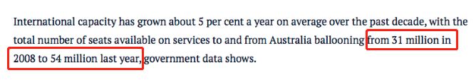 新基础设施、运输和区域经济局(BITRE)的统计数据显示,2017年3月至2018年3月的12个月内,澳洲国内航班座位减少了85000多个。然而,在同一时期内,乘客人数却又增加了240万。这是一个十分矛盾的数字。