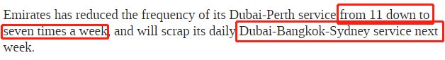 当然,导致航班数量减少的最主要原因依然是因为石油价格上涨,国际航班不得不削减班次,比如阿联酋航空已经将迪拜 - 珀斯服务班次从每周11次降至7次,并将取消每日往返迪拜 - 曼谷 - 悉尼的航班服务。