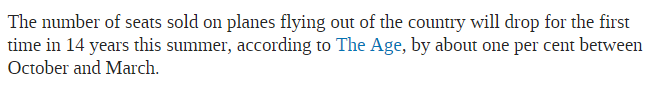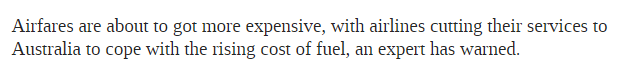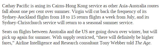 澳媒表示,航空也专家表示澳洲会出现国际机票价格上涨的主要原因是因为一批国际航空公司正在削减往返于澳洲的航线。