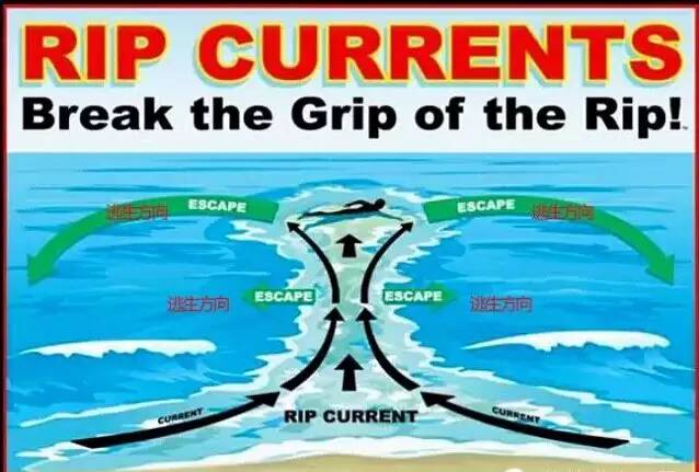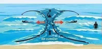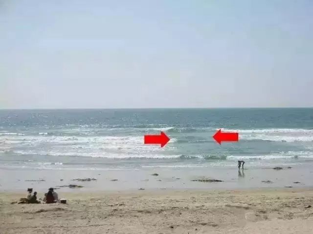 如何辨识离岸流:离岸流出现地点的海底都比两边低,海水表面白色浪向岸上冲,似涨潮;可海水下面蓝色水向海中间流,似退潮。
