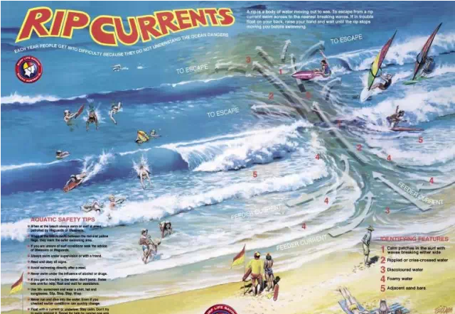 离岸流是一股射束似的狭窄而强劲的水流,它以垂直或接近垂直于海岸的方向向外海流去。是海滩最危险的杀手,是极易产生浪涡危险之地!即便是潜水能手遇到它也是十分危险!
