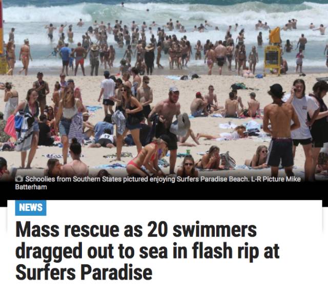 还有很多例子,比如曾经在黄金海岸发生的,20多人同时卷入离岸流,险些酿成巨大灾祸。