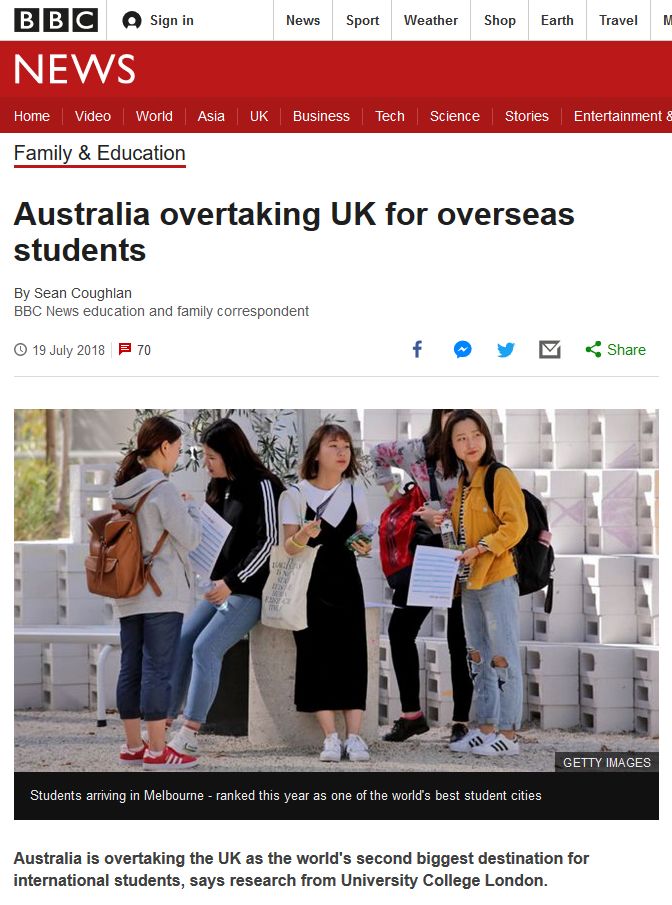 我们都知道,美国一直是全世界学生最喜欢的留学地,其次就是贵族刻板的英国,但是最近数据统计显示,英国第二的位置已经不保,根据BBC报道:澳洲已经超过英国成为世界第二大留学生青睐国度!