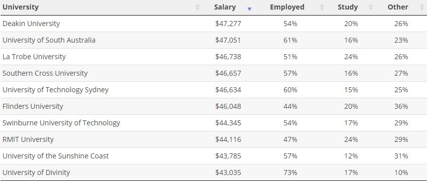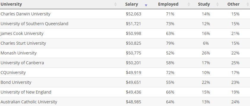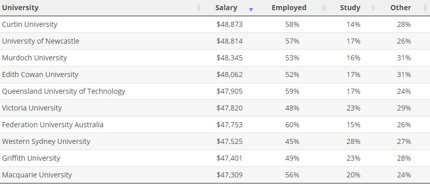 排名第二的是西澳大学,平均薪资60672澳币,它和墨尔本大学也是仅有的两所薪资超过6万的大学。有意思的是西澳大学毕业生就业率和阿德莱德大学同样并列前十的倒数第二...仅有40%。