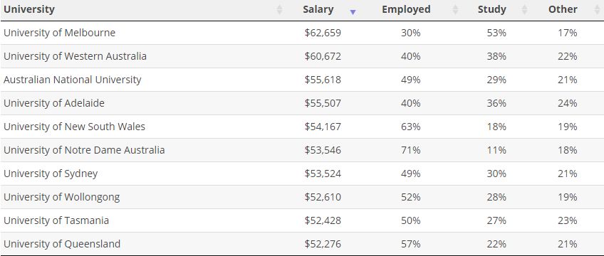 悉尼的两所同城名校,悉尼大学(52524澳币)和新南威尔士大学(54167澳币)的毕业生薪资差不多,新南威尔士大学的毕业生薪资稍高一点点,而且毕业生就业率远超悉尼大学,而悉尼大学更多的学生同样是选择继续进修。