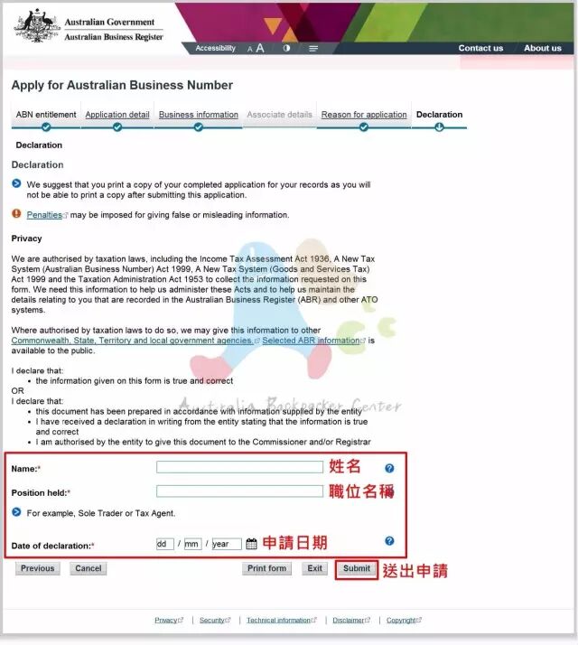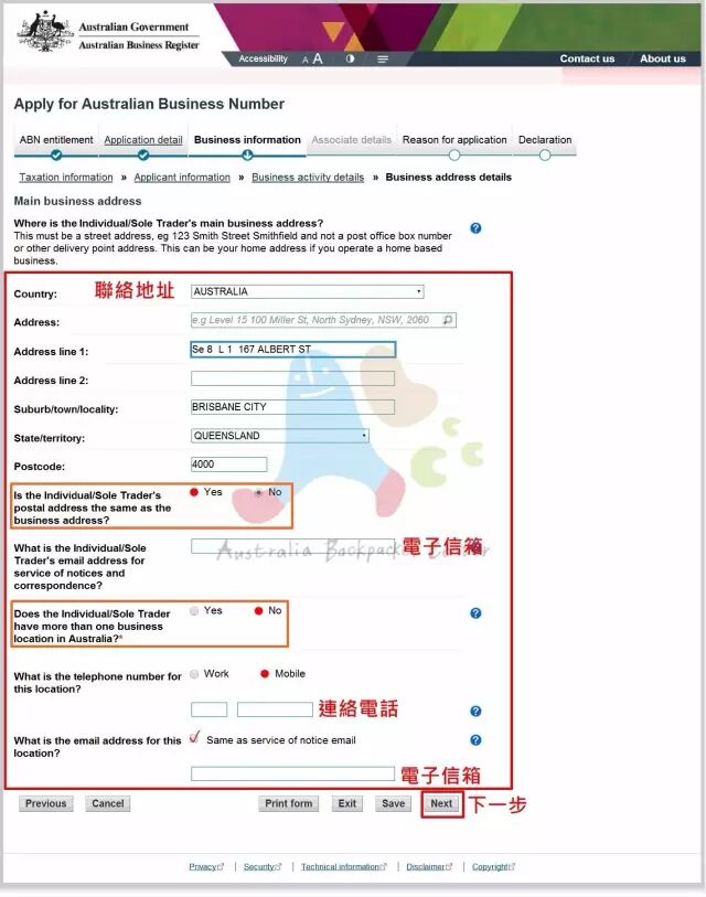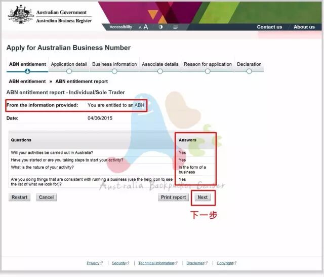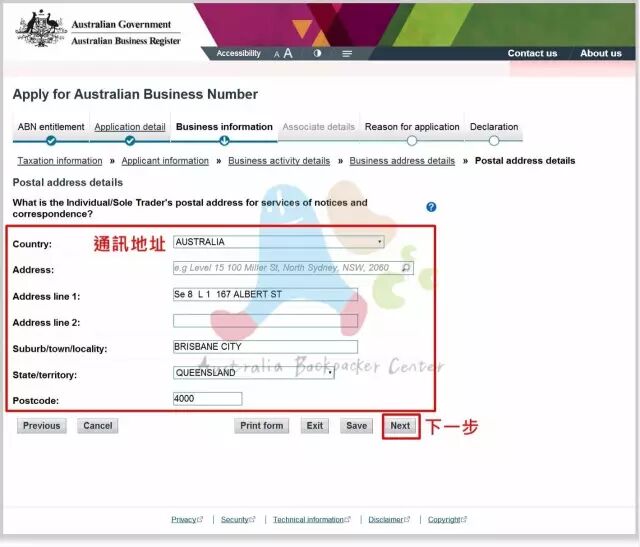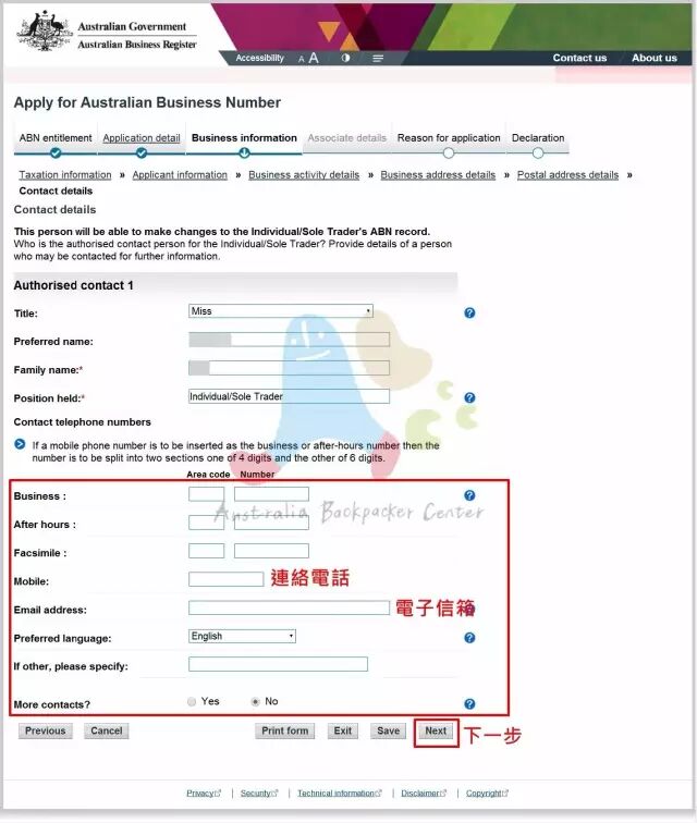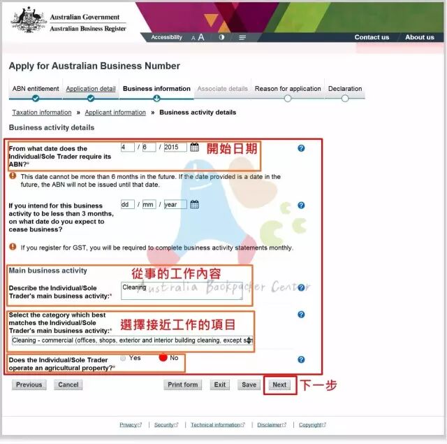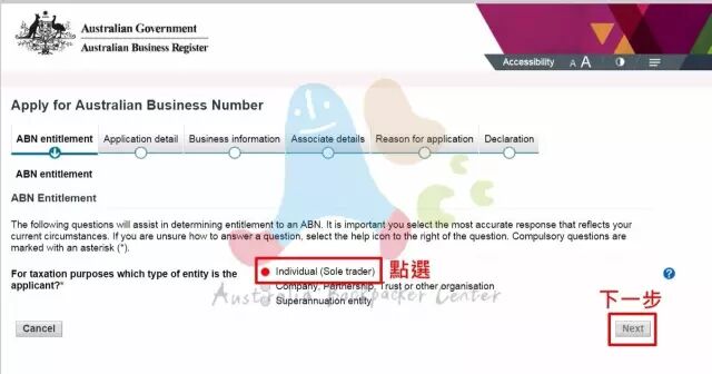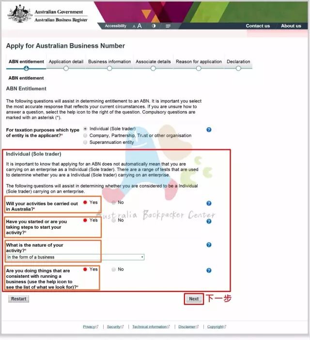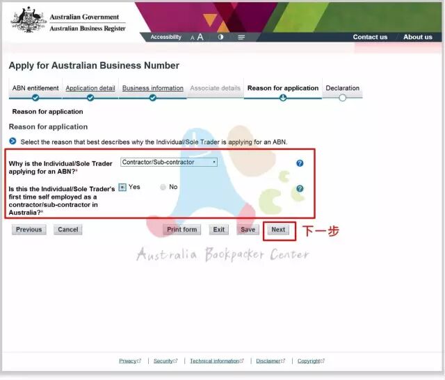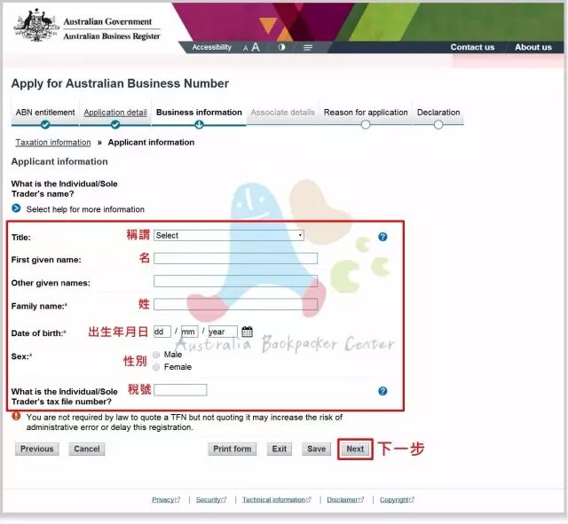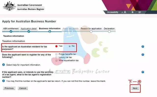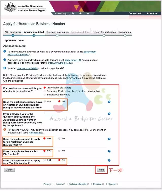 Step 7- 问几个基本相关的问题,ex 是否申请过ABN、个人税号。回答完毕之后,就按下一步《NEXT》。