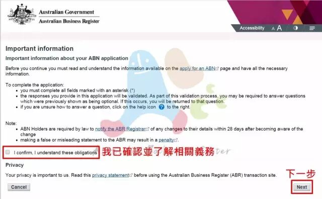Step 3 - 进入申请表之前,请先阅读基本的ABN的申请条件规范&义务,并完成勾选。接着就按下一步《Next》。